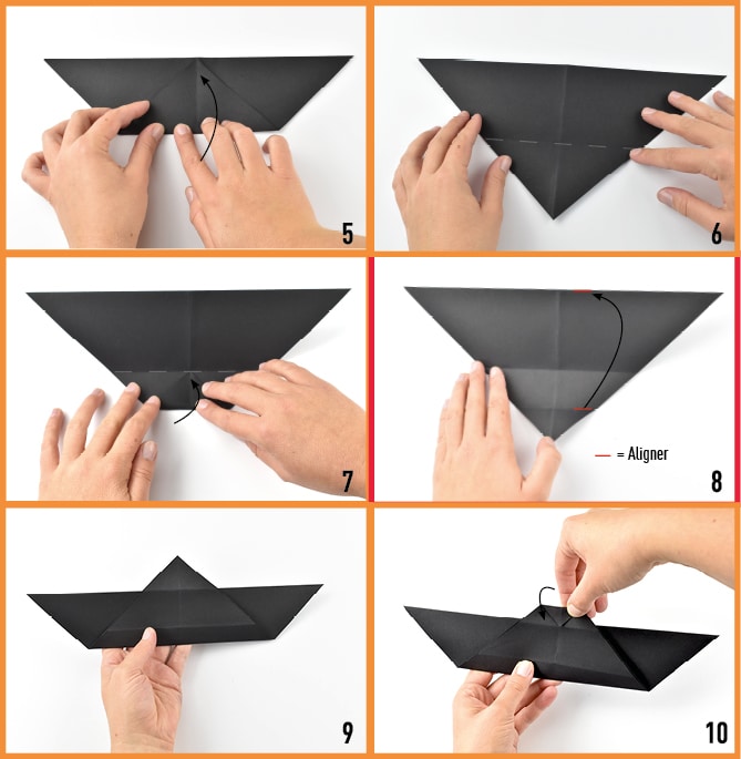 8-9 Ouvrez et faite un nouveau pli en alignant le dernier pli obtenu sur la base du triangle.