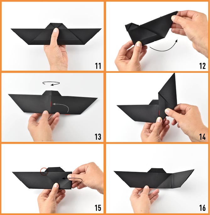 12-13 Pliez l’ensemble en deux vers l’arrière, réouvrez puis retournez (la petite pointe doit être au verso).