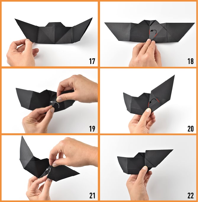 28-29 Appuyez sur les côtés du trapèze supérieur pour les plier vers l’arrière de manière à former la tête.