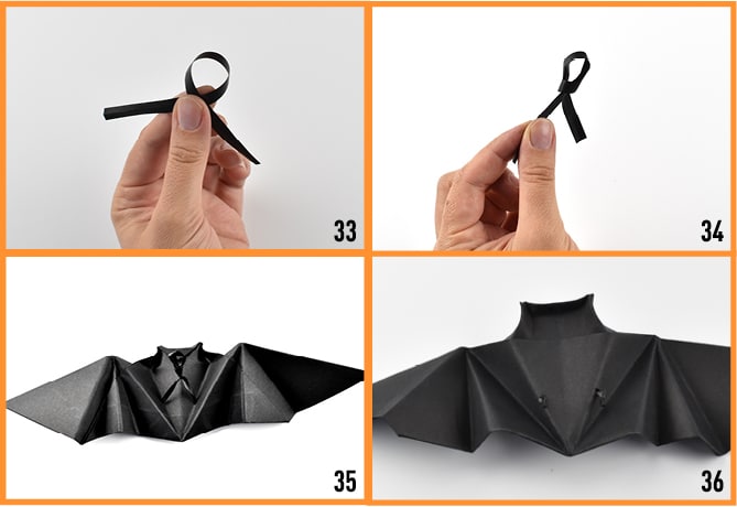 33-36 Pour pouvoir accrocher la chauve-souris, ou la suspendre, prenez un bout de ficelle ou de bolduc, faites une boucle en son centre, puis percez les côtés du corps de la chauve-souris avec un poinçon, faites-y passer les extrémités du fils par l’arrière, faites 2 nœuds pour former les pattes. Vous pouvez maintenant y glisser un fil pour faire une guirlande pour bien les suspendre à un crochet.