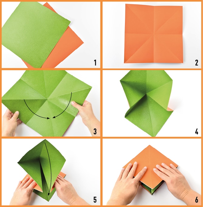 3-6 Tournez la feuille de manière à avoir un des angles en face de vous, face verte visible. Prenez les deux angles situés à droite et à gauche et rabattez-les de manière à ce que les plis traversants ces angles s’alignent avec le pli central de la feuille. Vous obtenez un carré orange.