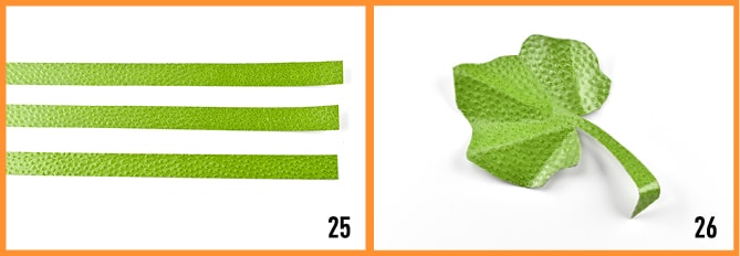 26- Pour apporter une touche d’élégance à votre panier et le compléter, découpez la forme d’une feuille de citrouille sur le papier vert, en deux exemplaires pour plus de rigidité (gabarit disponible ici). Collez-les entre elles et pliez-les pour leur donner du relief. Vous pouvez ensuite plier la tige et la coller sur le rebord intérieur du panier.