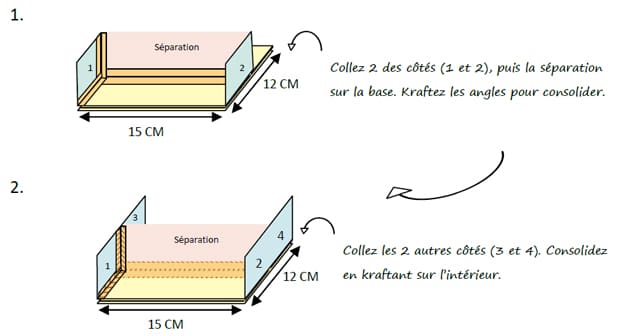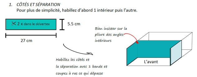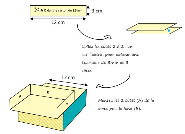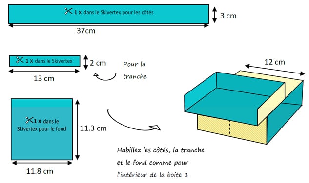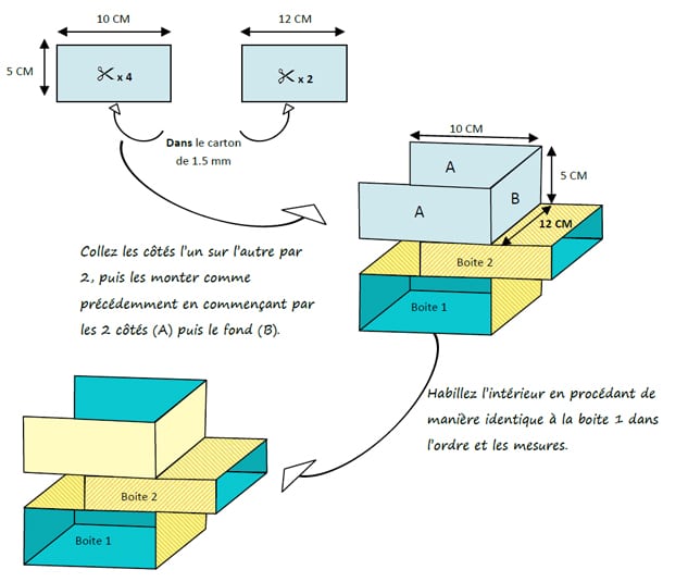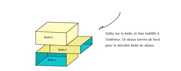 Si vous voulez l’ordre de réalisation est le montage d’une 1ère boite et son habillage intérieur, puis le montage de la 2nde boite et son habillage intérieur, et enfin le montage de la 3ème boite et son habillage intérieur.