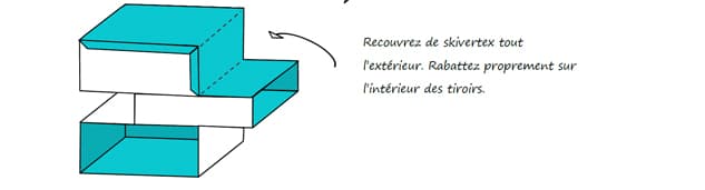 L’habillage vient à la fin et dans les explications avant l’explication des tiroirs. Vous devez recouvrir de rigidex partie par partie l’extérieur, puis recouvrir avec votre habillage final partie par partie.