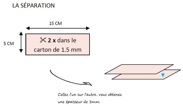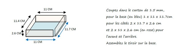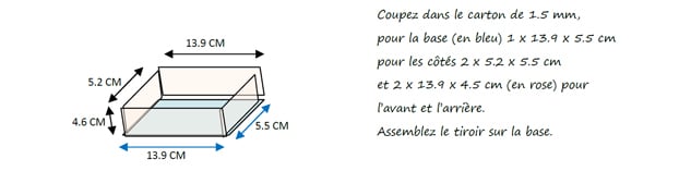 Cette boite demande beaucoup de précisions dans les coupes et le montage. Sylvie a privilégié le carton en 1.5 mm d’épaisseur pour faciliter la coupe. Les cartons sont coupés 2 fois et coller l’1 sur l’autre pour obtenir une épaisseur de 3mm pour la boite et coupés 1 seule fois pour les tiroirs qui font donc 1.5 mm d’épaisseur.