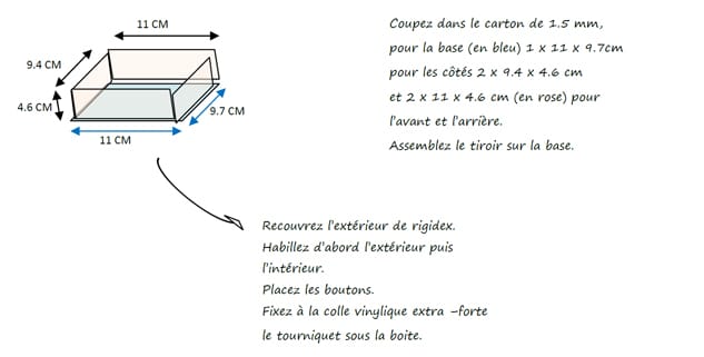 Nous avons fait simple, nous avons collé le mécanisme sous la boite à la colle néoprène. vous pouvez si le souhaiter recouvrir le mécanisme avec du papier en utilisant simplement la colle vinyllique extra-forte. Merci de votre commentaire, comme ça nous allons le rajouter dans le tuto. 🙂 Avez- vous commencer à réaliser la boite?