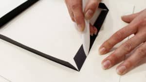 À l’aide du gabarit, ouvrez les angles à l’intérieur de la marge. Marquez les plis au plioir. Encollez et rabattez. Coupez le papier dépassant à l’extérieur sur les 4 cotés. Mettre en attente sous presse.