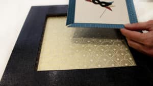 Nettoyez le verre avec un chiffon propre. Le posez sur la marge. Collez le kraft humidifié sur 2 mm sur le bord du verre, puis sur les cotés des cartons et rabattre au dos.
