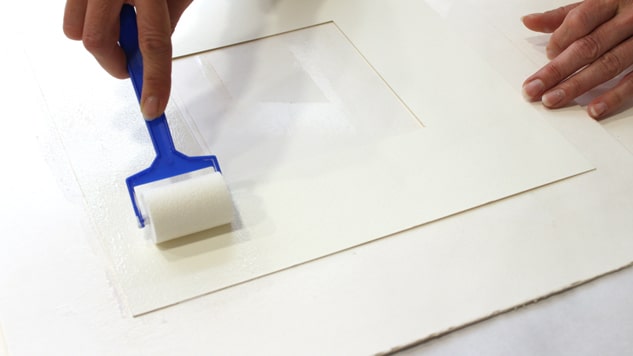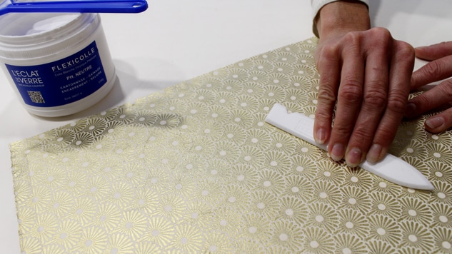 Encollez l’une des cartonnettes au rouleau mousse et la coller sur l’envers du papier Kahori ivoire – or réf. 24283. Lissez le papier au plioir pour chasser les bulles et les plis. Coupez le papier dépassant sur les 4 cotés. Et mettre en attente sous presse.