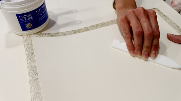 Nettoyez le verre avec un chiffon propre. Le posez sur la marge. Collez le kraft humidifié sur 2 mm sur le bord du verre, puis sur les cotés des cartons et rabattre au dos.
