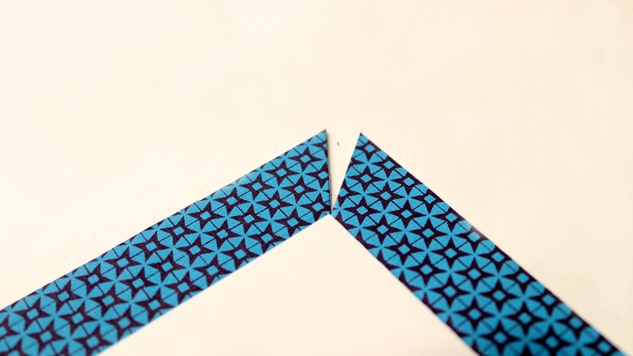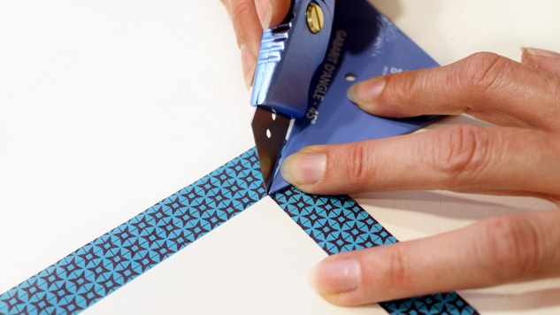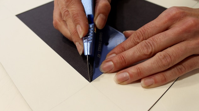 Coupez les angles de la cartonnette en vous aidant du gabarit d’angle 45°, à 5 mm de chaque coté des bissectrices. Marquez au plioir le tour de la carte et relevez les bords.