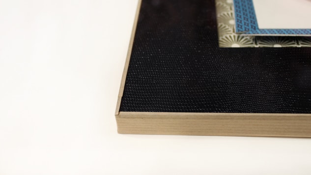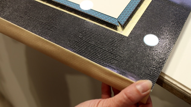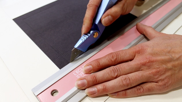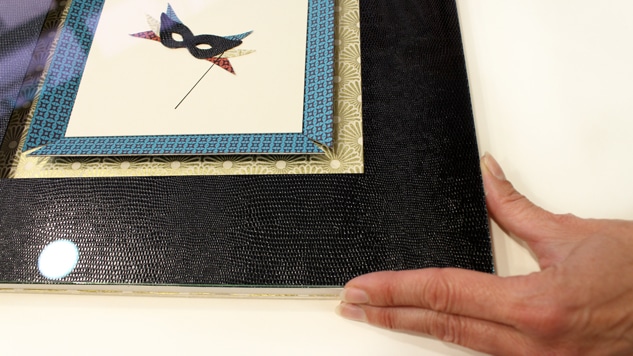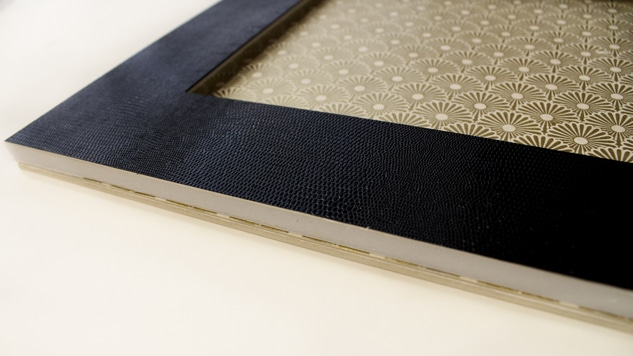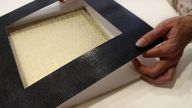 Tracer au compas crayon des marges à 6 cm sur l’une des cartonnettes. Ouvrez les marges avec la règle lourde et le cutter. Encoller et recouvrir la marge sur l’envers du papier imitation cuir lézard.