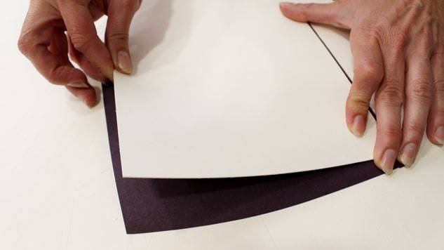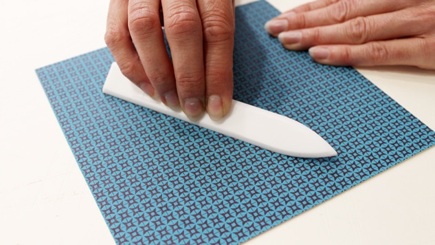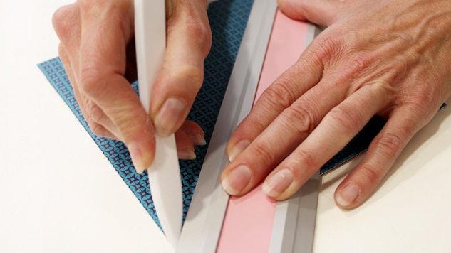 À l’aide du gabarit, ouvrez les angles à l’intérieur de la marge. Marquez les plis au plioir. Encollez et rabattez. Coupez le papier dépassant à l’extérieur sur les 4 cotés. Mettre en attente sous presse.