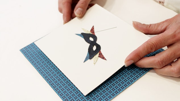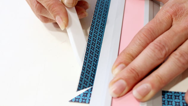 Collez le papier Andy prune – turquoise réf. 24748 sur la cartonnette du passe fantaisie, puis coupez à ras tout autour. Marquez les bissectrices au plioir. Collez la carte sur les bissectrices.