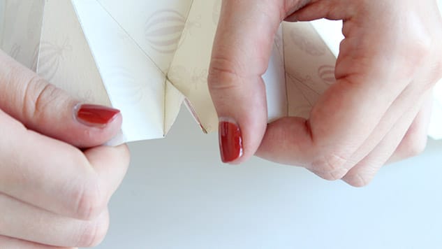 La dernière étape de pliage est un peu délicate. Il s’agit de plier les perpendiculaires des petits triangles qui nous permettront de donner du volume à notre vase. C’est un pli entrant.